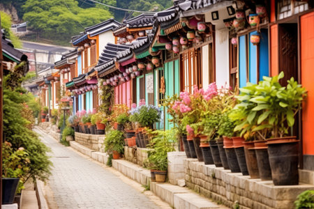 This serene alleyway showcases traditional Korean Hanok houses surrounded by lush greenery, creating a tranquil atmosphere perfect for exploring cultural heritage.