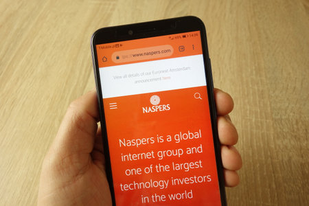 KONSKIE, POLAND - May 18, 2019: hand holding smartphone with Naspers company website displayed on screen