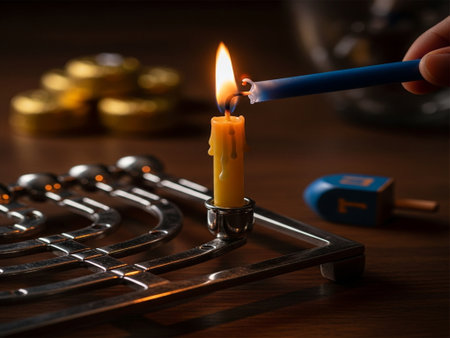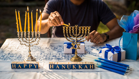 A person lights the menorah during Hanukkah, surrounded by gifts and festive decorations, symbolizing the celebration of faith and tradition.