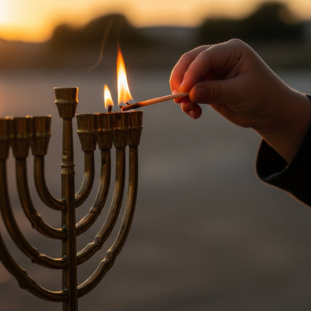 Hand lighting a Hanukkah menorah with a burning match