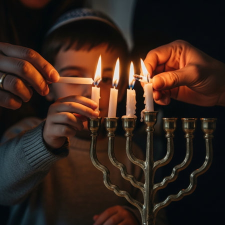 Hands of parents and son lighting candles during Hanukkah celebration