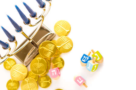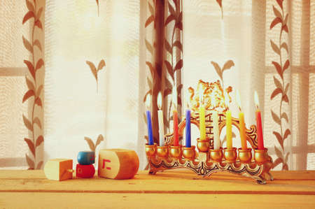 Image of jewish holiday Hanukkah with menorah (traditional Candelabra) and wooden dreidel (spinning top)