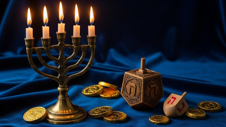 A beautifully crafted menorah with lit candles, surrounded by dreidels and gold coins, set against a blue velvet background.
