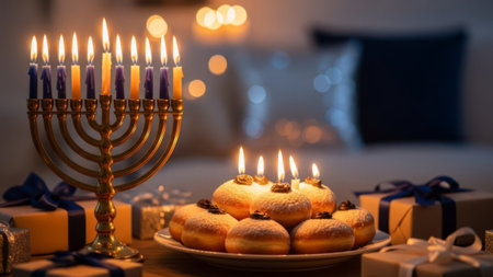 Hanukkah celebration with lit menorah, sufganiyot, gifts and bokeh.