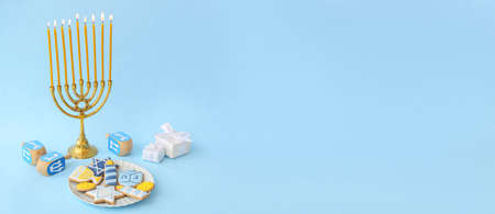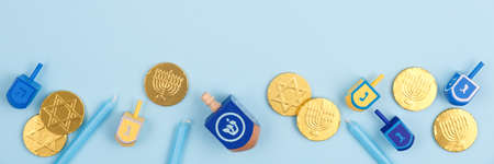 Blue background with multicolor dreidels, menora candles and chocolate coins. Hanukkah and judaic holiday concept. Horizontal, banner format