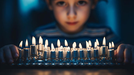 A stunning menorah with glowing candles illuminates a cozy room during Hanukkah. Surrounded by festive decorations, this scene captures the warmth and joy of this special celebration.