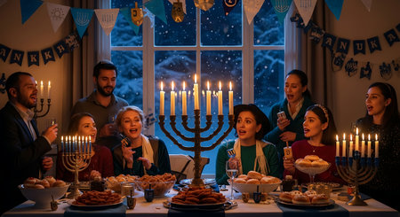 Diverse friends and family gather for a joyous Hanukkah celebration with lit menorahs, food, and singing.