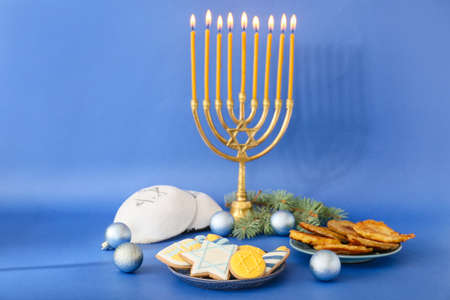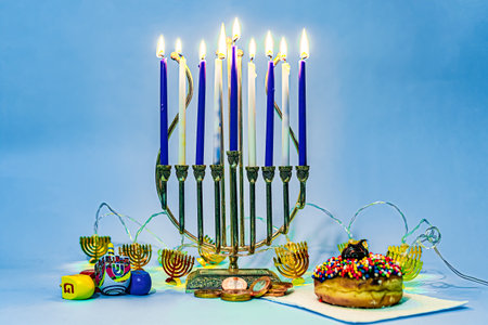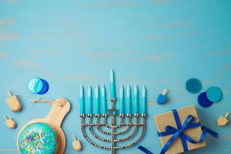 Jewish holiday Hanukkah background with menorah- traditional candelabra, spinning top and doughnut on blue background