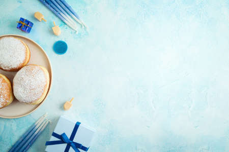 Hanukkah sweet donuts sufganiyot (traditional donuts) with powdered sugar and fruit jelly jam, gift boxes, spinnig driedel and candles on blue paper background. Jewish holiday Hanukkah concept. Top view, copy space.