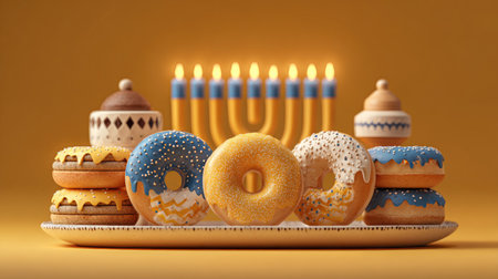 A colorful arrangement of festive donuts and cookies on a decorative plate, showcasing vibrant colors against a warm background with a menorah and candles, perfect for holiday celebrations.