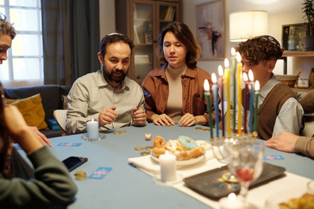 Bearded mature man and his daughter looking at dice while playing leisure game with dreidel, coins and other items after Hanukkah dinner