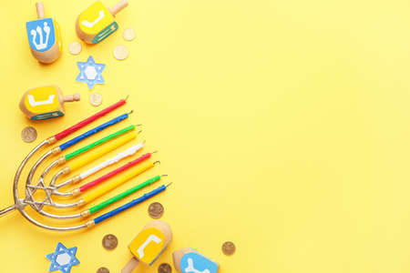 Religion image of jewish holiday Hanukkah background with menorah (traditional candelabra), spinning top and candles