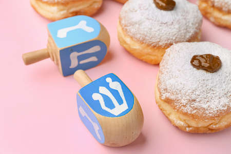 Donuts and dreidels for Hanukkah on color background