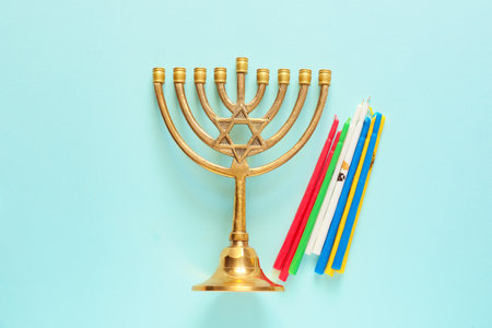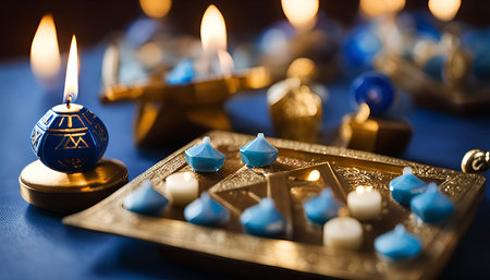 A close-up of a blue and gold Hanukkah menorah with lit candles. The menorah is a symbol of the Jewish faith and is used to celebrate Hanukkah, the Festival of Lights.