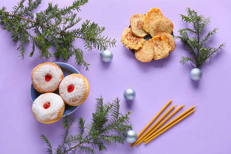 Sufganiyah and latkes for Hanukkah celebration with Christmas decor on color background