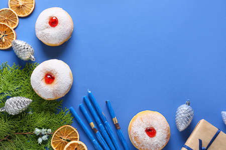 Sufganiyah donuts for Hanukkah celebration with Christmas decor on color background