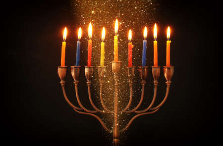 image of jewish holiday Hanukkah background with menorah (traditional candelabra) and burning candles. glitter overlay