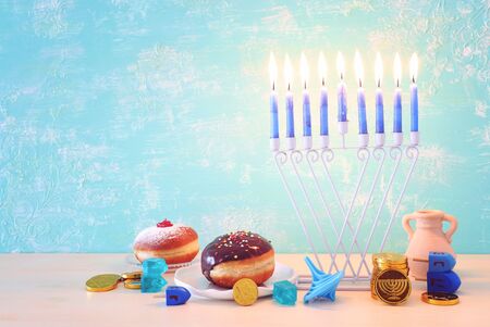 Selective focus image of jewish holiday Hanukkah with menorah traditional Candelabra and donuts