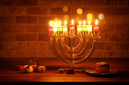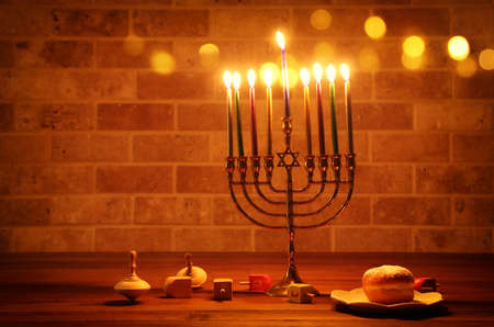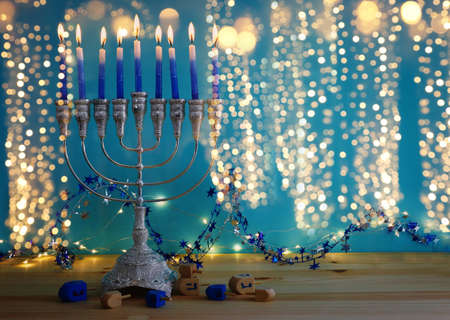 image of jewish holiday Hanukkah with menorah traditional Candelabra and wooden dreidels spinning top