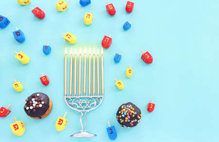 Image of jewish holiday Hanukkah with menorah (traditional Candelabra), donut and wooden dreidel (spinning top)