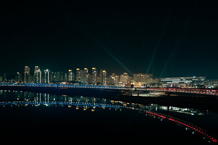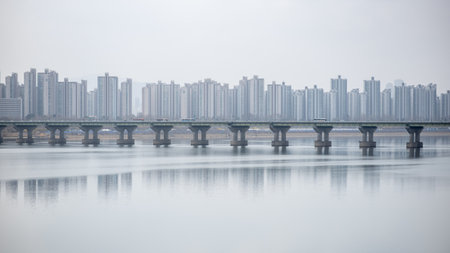 Amazing top view of the Han River (Hangang) in Seoul, South Korea. Wonderful cityscape. Seoul is a popular tourist destination of Asia.