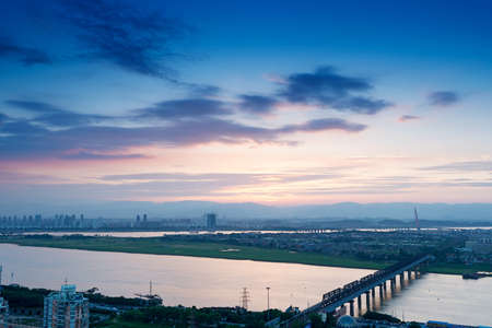 Sunset view of the city river bridge