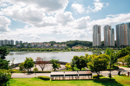 Hwaseong, Korea - September 12, 2022 : Panoramic view of Dongtan New Town and Dongtan Lake Park
