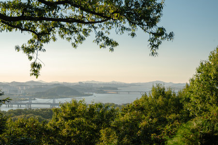 Panoramic view of Han river and Seoul city from Haengjusanseong Fortress at sunset in Goyang, Korea