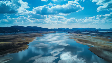 Discover a breathtaking aerial view showcasing a tranquil river landscape beneath a bright blue sky, adorned with soft clouds reflecting on shimmering water.