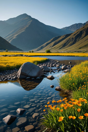 Mountain river with yellow flowers in the foreground and mountains in the background