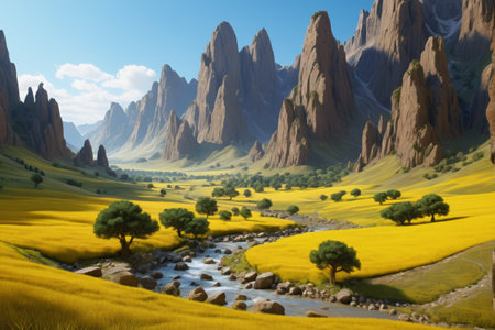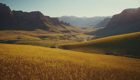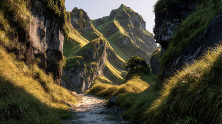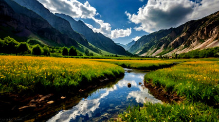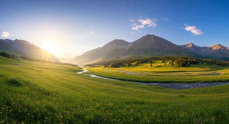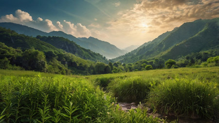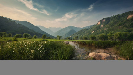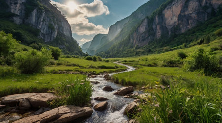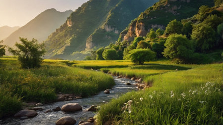 A breathtaking view of a tranquil mountain valley featuring lush green hills, a gentle stream, and a stunning landscape bathed in soft sunlight. A perfect escape.