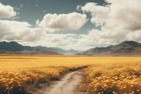 Idyllic Landscape: Yellow Flower Field Harmonizing with Mountain Peaks under White Clouds - AR 3:2