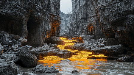 A stunning view of molten lava flowing through a rocky canyon, showcasing the dramatic interplay of fire and nature's rugged beauty. A breathtaking landscape awaits.