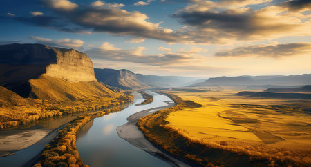A serene landscape featuring a winding river flowing through a valley surrounded by majestic mountains at sunset, with warm light illuminating the scene
