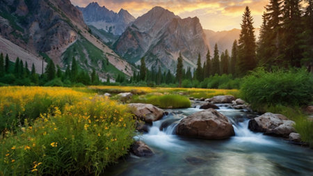 Mountain landscape with a river and wildflowers at sunset.