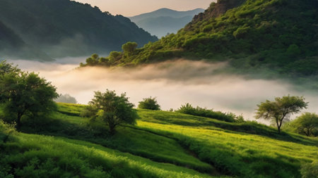 This stunning valley landscape captures the essence of nature's beauty, featuring rolling hills, lush greenery, and misty mountains under a serene sky.