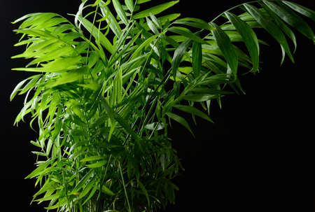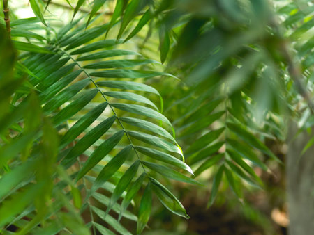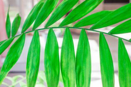 Brunches of palm tree. Green leaves background. Wallpaper with thin palm leaves