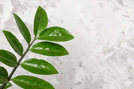 Branch with leaves of zamiokulkas close-up on the background of a gray stone wall. Front view, Copy space.