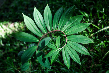 A sunlit portrait of a single Bamboo palm, photographed outdoors on a clear, breezy day. Fresh, crisp air renders vivid detail in the leave veins glowing with gentle backlight. The background falls into a soft natural bokeh of greenery, colors truetolife, organic beauty in pure sunlight.