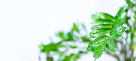 Close-up leaves of a houseplant zamioculcas against a white background.