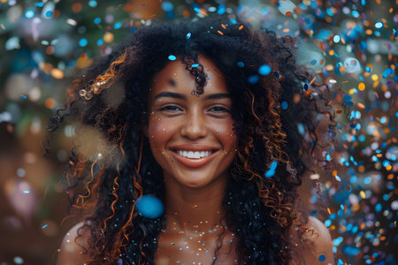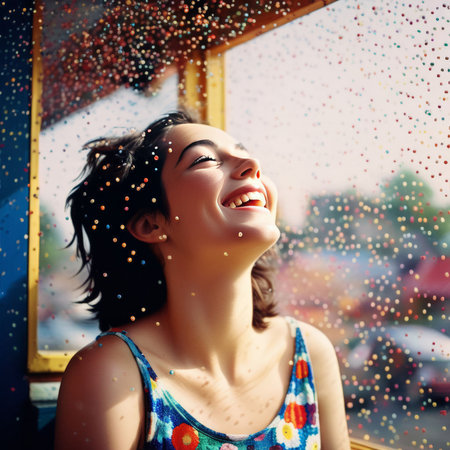 Young Womans Joyful Laughter and Carefree Spirit Under a Colorful Shower of Confetti