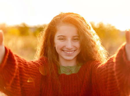 Portrait of a beautiful young woman smiling on the beach at sunset
