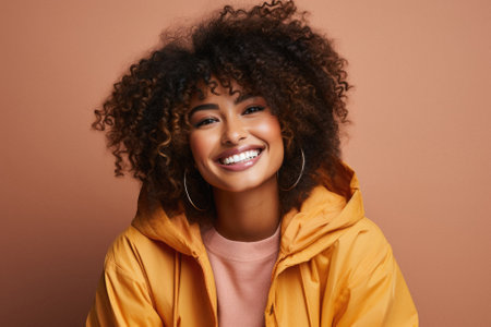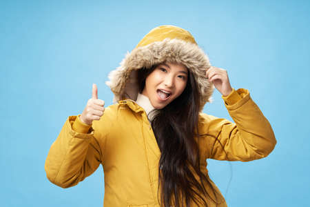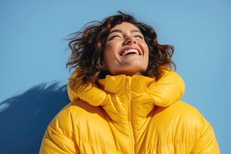 Portrait of white cool woman, wearing a jacket with hood, against a yellow background.