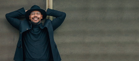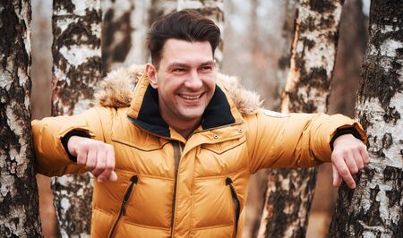Cheerful man in coat laughing studio modern lifestyle lifestyle