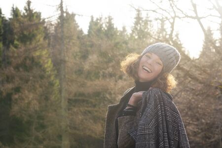 Joyful woman outdoors in a knit sweater and warm coat, laughing with hands in sleeves, autumnal field and trees in the background, a vibrant candid moment