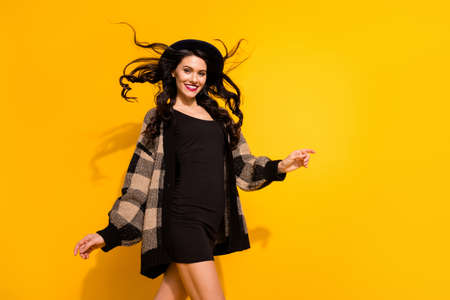 Photo of attractive happy young woman walk weekend rest smile copyspace isolated on yellow color background