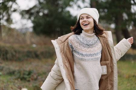 Woman enjoying outdoor weather in a warm sweater and beanie, wearing a light jacket, smiling, in a park setting with trees and open space, autumn mood and relaxed casual style.
