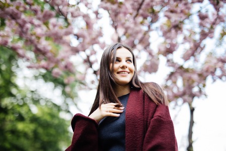 Outdoor portrait of young beautiful fashionable lady posing near flowering tree.