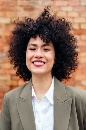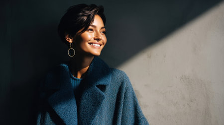 closeup portrait of an elegantly dressed business woman near a blue wall of a modern office building
