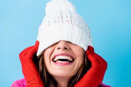 joyful woman in red gloves covering eyes while touching white hat isolated on blue